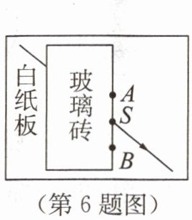 6. 如图所示,在研究光的折射规律时,小明让一束激光沿白纸板照射,把手指头放于 $S$ 点时刚好接收到红色的亮点.然后将玻璃砖放于白纸板上,激光经玻璃砖转向右侧照射,他想要接收到红色的亮点,应将手指头(