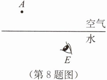 8. 如图所示,在水面下 $E$ 点处的潜水员看到岸上的路灯位于 $A$ 点处,请找出路灯的大致位置 $B$ 点,并画出光路图.