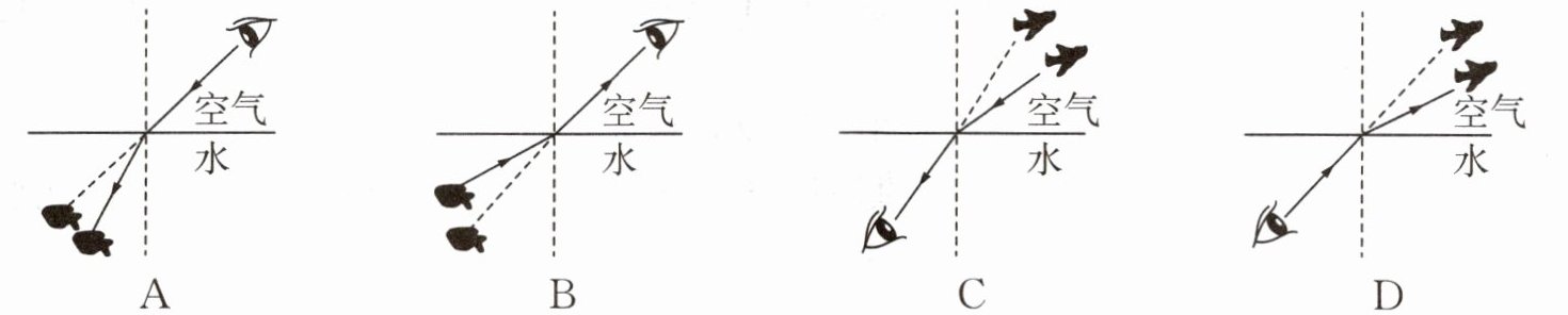 6. 游客站在岸上欣赏水中的金鱼,潜水员在水中观看空中的飞机,两种情况人眼看到的虚像与金鱼和飞机的真实位置都不同.下列能正确解释此现象的光路是(