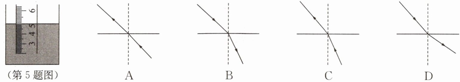 5. 如图所示,把直尺竖直插入水中,水面在 $5\mathrm{cm}$ 附近,可以看到直尺的水中部分刻度线变得密集了.下列四幅光路图,能够正确说明其道理的是(