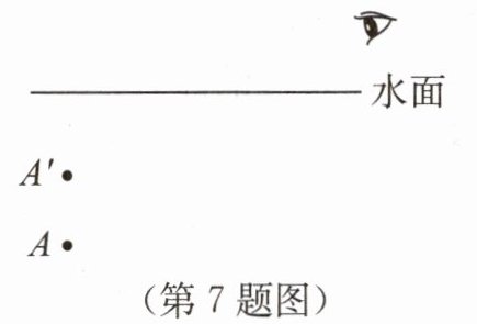 7. 清澈的水看似很浅,实则很深,不明水情擅自下水容易发生溺水事故.请在图中画出人眼看到池底 $A$ 的大致光路图($A'$ 是人眼看到的池底 $A$ 的像).