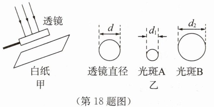 18. 小明为辨别直径相同的两个透镜的类型,分别将它们正对太阳,把一张纸放在透镜下方等距的位置,如图甲所示,在纸上得到相应的光斑A、B。透镜与光斑的大小如图乙所示($d_1 < d < d_2$)。其中,形成光斑A的是