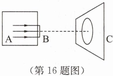 16. 如图所示,A是一个水平放置的长方体暗盒,盒内有水平向右的平行光,B为暗盒右侧平面上的一个圆孔,C是一个与暗盒右侧平面平行的相距一定距离的光屏。若在外径与圆孔B内径相同的厚玻璃板、凹透镜、凸透镜这三个光学器件中取一个嵌入圆孔B中,发现在光屏C上呈现一个比圆孔大的圆形光斑,则嵌入圆孔B的那个光学器件是(