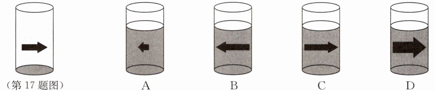 17. 某同学找来一个薄壁圆柱形的玻璃杯,并将画有箭头的白纸靠在玻璃杯的一侧,透过玻璃杯,可以看到纸上的箭头如图所示。向杯中加水,使得水面高过箭头位置,透过玻璃杯观察纸上的“箭头”。将白纸逐渐远离杯子的过程中,下列选项中不可能观察到的现象是(
