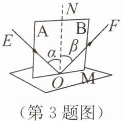 3. 如图所示,平面镜 $ M $ 水平放置,白色纸板竖直地立在平面镜上,纸板由 $ A $、$ B $ 两部分组成,可绕接缝 $ ON $ 翻折.使一束光紧贴纸板 $ A $ 射向镜面上的 $ O $ 点,只有当纸板 $ B $ 翻折至图中位置时,才能观察到纸板 $ B $ 上呈现反射光线,可知反射光线、入射光线和法线在