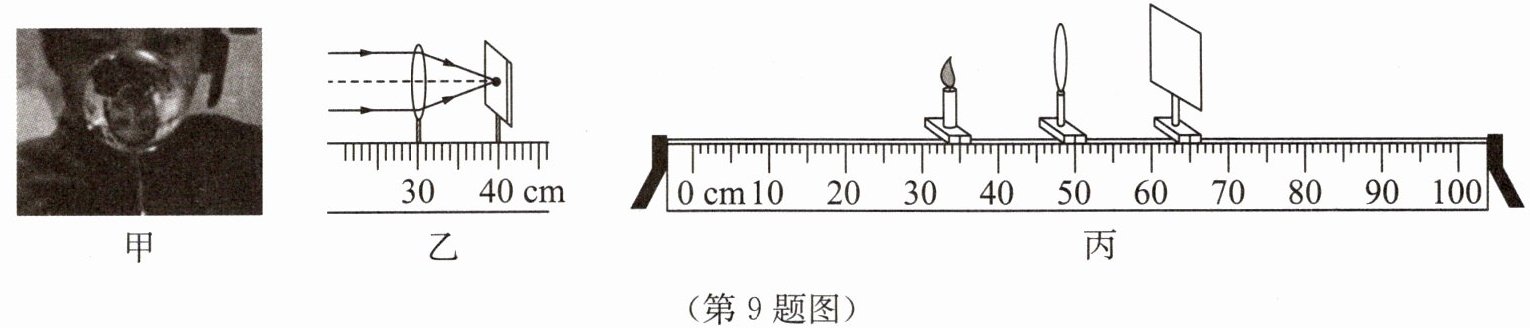 9. 在“天宫课堂”的水球实验中,小华看到王亚平老师倒立、缩小的像,如图甲所示.小华利用实验室的光学器材探究凸透镜成像的规律.