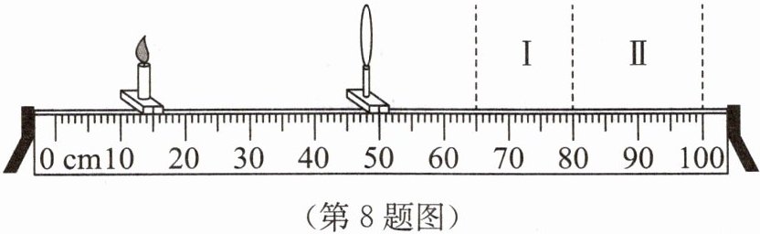 8. 小华用如图所示的装置探究凸透镜成像的规律,凸透镜的焦距是 $15\ cm$.当把凸透镜固定在 $50\ cm$ 刻度线处,蜡烛固定在 $15\ cm$ 刻度线处时,下列说法正确的是(