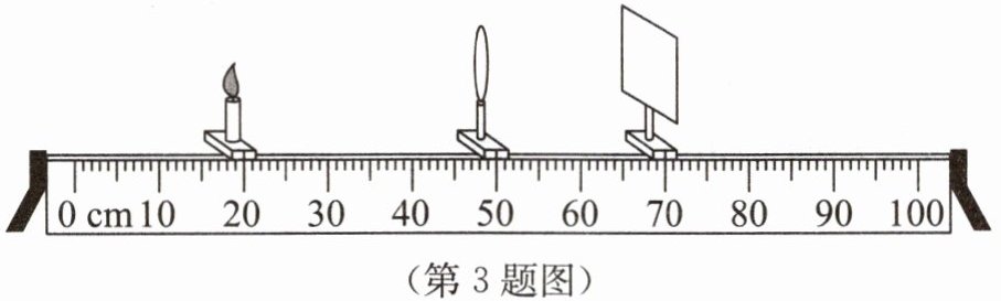 3. 在“探究凸透镜成像的规律”实验中,凸透镜的焦距$f = 12$ cm,蜡烛、凸透镜、光屏在光具座上的位置如图所示,此时烛焰在光屏上成清晰的像.下列判断正确的是(