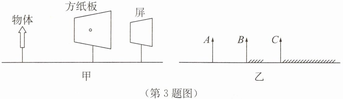 3. 小明做小孔成像的实验,所用的实验器材有用发光二极管做成的物体、有小孔的方纸板、用半透明塑料膜做成的屏、量程为 0~30 cm 的直尺,实验装置的示意图如图甲所示。