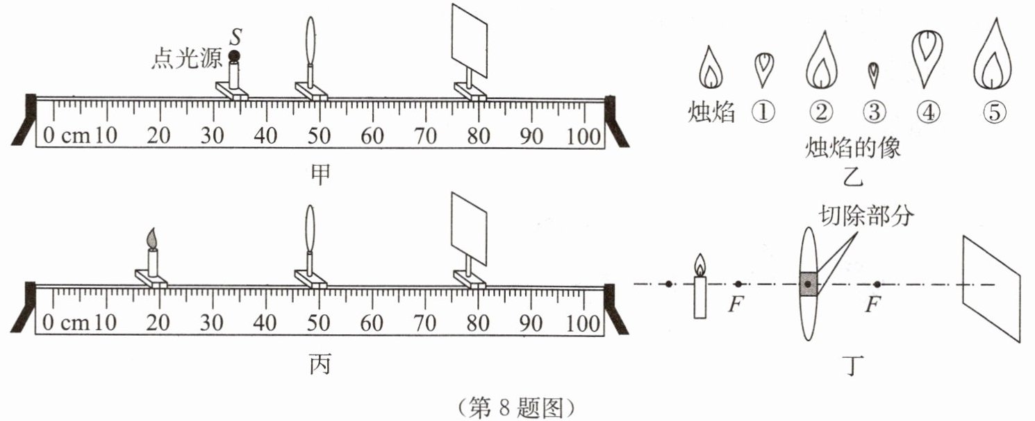 方移动.(5) 如图丁所示,将蜡烛放在图示位置,光屏上恰好成清晰的像,若仅切除透镜中间的阴影部分,则烛焰在光屏上能成