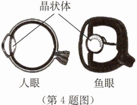 4. 鱼眼与人眼的结构示意图如图所示.我们观察发现:像鱼这样的眼睛如果到陆地上观察物体,像将成在视网膜的前面.童话世界中生活在水里的美人鱼,上岸后,若要看清远处的物体,则应该佩戴 (