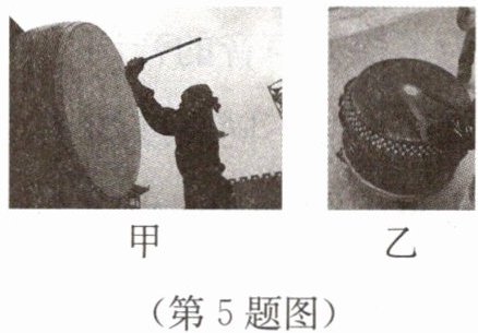 5. 如图所示,甲鼓发声时鼓皮每秒振动的次数比乙鼓的少,甲、乙相比,甲鼓(