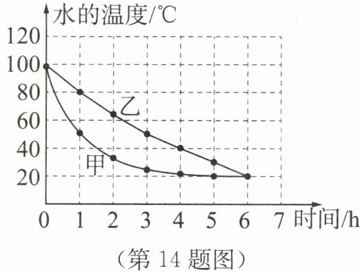 14. 有甲、乙两种不同品牌的保温杯,为了比较这两种品牌的保温杯盛水时的保温效果,小明按照科学探究的程序,明确了具体的探究问题,选择了适当的器材,在控制变量的前提下,在室内进行了实验,得到了一段时间内甲、乙两种保温杯内水的温度变化的实验数据,根据数据绘制的图像如图所示。请你根据图像所提供的信息回答下列问题: