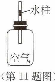 11. 小明用瓶塞、细玻璃管和一段小水柱在玻璃瓶中封闭了一瓶空气,制作成一个简易温度计,如图所示。周围温度变化时,小水柱会向上或向下移动,导致水柱移动的主要原因是(