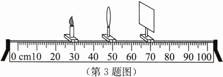 3. 蜡烛、凸透镜和光屏在光具座上的位置如图所示,所用凸透镜焦距$f = 10\ cm$.根据凸透镜成像的规律,下列说法正确的是(