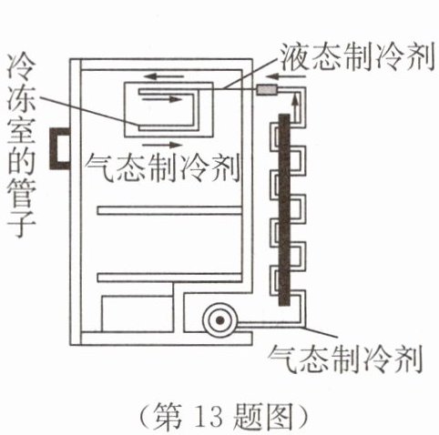 13. 某品牌冰箱使用的新型制冷剂是一种对臭氧层破坏较小、极容易汽化又容易液化的物质.如图所示是制冷剂循环路线示意图,制冷剂在冷冻室的管子里发生的物态变化是