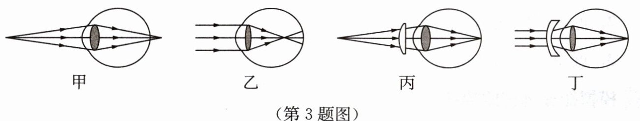 3. 现代生活中,智能手机给人们带来了许多便利,但长时间盯着手机屏幕,容易导致视力下降。图中关于近视眼及其矫正的原理正确的是(