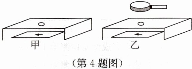 4. 为了模拟探究显微镜的工作原理,小明在白纸上画上红色箭头,放在高约为 $ 15\ mm $ 的透明塑料盒下方,在盒的上方滴上一滴水,如图甲所示,通过水滴(相当于凸透镜)可看到位于水滴下方红色箭头放大的像;将一个焦距为 $ 30\ cm $ 的凸透镜放在水滴正上方,如图乙所示,保持凸透镜水平,调整凸透镜与水滴之间的距离,会看到箭头更大的像.关于该实验,下列说法正确的是(