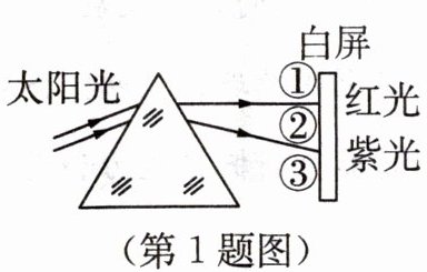 1. 如图所示,让一束太阳光通过三棱镜射到白屏上,屏上标出了三个区域①②③.利用区域