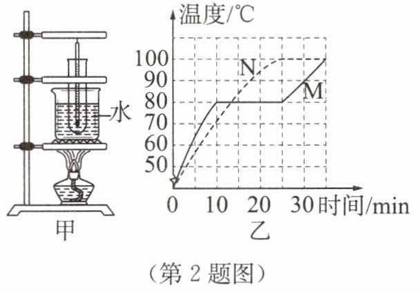 2. 有两套完全相同的加热装置(如图甲所示),这两套装置的试管中分别装有适量的M固体和N固体,它们的加热时间一温度曲线如图乙所示,在35 min内M物质从固态熔化成了液态,N物质始终是固体,则下列说法正确的是(