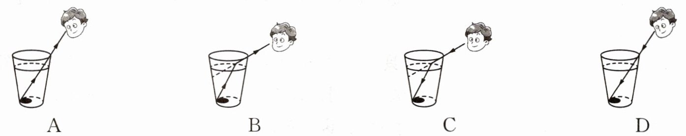 3. 学了光的折射现象后,小刚和小红一同做了“浮起的硬币”实验:把一枚硬币放在一个没有盛水的杯子底部,然后把杯子放在水平桌面上。小刚注视着硬币保持眼睛的高度不变,人慢慢向远处移动,到眼睛刚好看不到硬币时停止移动。小刚保持头部不动,此时小红缓缓地向杯中倒水,随着水量的增加,小刚又重新看到杯底的硬币。如果用作图的方法来解释这个实验现象,下列的光路图中能对上述实验现象做出正确解释的是(