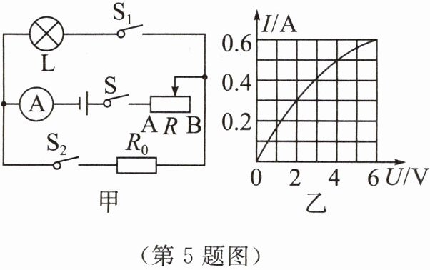 5. 如图甲所示,电源电压保持不变,L 是标有“6 V 3.6 W”字样的小灯泡,通过它的电流和它两端的电压关系如图乙所示,$ R_0 $ 为定值电阻.当开关 $ S $、$ S_1 $、$ S_2 $ 都闭合,且滑动变阻器的滑片位于 A 端时,小灯泡恰好正常发光,此时 $ R_0 $ 消耗的功率为 $ P_1 $;当 $ S $、$ S_1 $ 闭合,$ S_2 $ 断开,滑动变阻器的滑片滑到中点时,电流表的示数为 0.5 A;当 $ S $、$ S_2 $ 闭合,$ S_1 $ 断开,滑动变阻器的滑片滑到 B 端时,$ R_0 $ 消耗的功率为 $ P_2 $,且 $ P_1 : P_2 = 9 : 4 $.求: