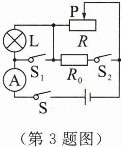 (3) S、$S_1$、$S_2$闭合时,L与$R_0$并联后与R串联。L额定电压$2.5\,V$,并联电压$U_{并}\leq2.5\,V$。