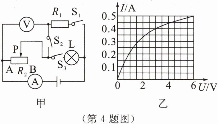 4. 如图甲所示,L 是标有“6 V 3 W”字样的小灯泡,其 $ I - U $ 图像如图乙所示,$ R_1 $ 是标有“* 0.5 A”字样的定值电阻,$ R_2 $ 是标有“30 Ω 1 A”字样的变阻器,电压表量程为 $ 0 \sim 3 $ V,当开关 $ S_1 $、$ S_2 $、$ S_3 $ 都闭合,且将滑片 P 调至 A 位置时,灯泡正常发光,电流表示数为 0.8 A.