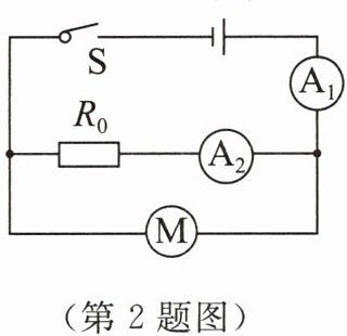 2. 在如图所示的电路中,定值电阻 $R_{0}$ 的阻值为 $20\Omega$,电动机线圈电阻为 $2\Omega$,闭合开关,电流表 $A_{1}$、$A_{2}$ 的示数分别为 $0.8A$、$0.3A$,则该电路电源电压为