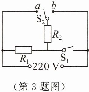 当$S_1$断开,$S_2$接$b$时,$R_1$与$R_2$串联,此时电路总电阻最大,根据$P=\frac{U^{2}}{R}$,功率最小,为低温挡。