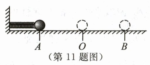 11. 如图所示,在光滑的水平台面上,一轻弹簧左端固定,右端连接一金属小球,点 $O$ 是弹簧保持原长时小球所在的位置.压缩弹簧使小球至点 $A$ 位置,然后释放小球,小球就在 $AB$ 间做往复运动(已知 $AO = OB$).小球从点 $A$ 运动到点 $B$ 的过程中,下列判断中正确的是(