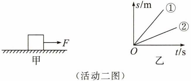 3. 如图甲,木块放在水平面上,用弹簧测力计沿水平方向拉木块使其做直线运动,两次拉动木块得到的$s - t$图像分别是图乙中的图像①②.两次对应的弹簧测力计的示数分别为$F_{1}$、$F_{2}$,两次拉力的功率分别为$P_{1}$、$P_{2}$.则$F_{1}$