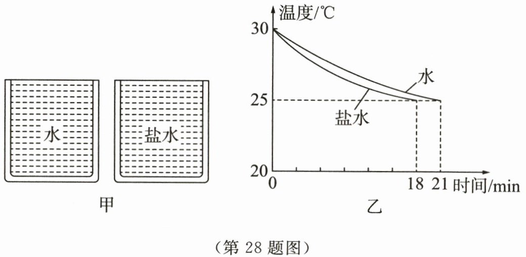 (4) 如图甲所示,用两个同样的保温杯分别装满水和盐水,水和盐水的温度都是 $30^{\circ}C$,周围环境温度保持 $20^{\circ}C$ 不变,保温杯敞开口,水和盐水温度随时间变化的图像如图乙所示.已知水的比热容为 $4.2× 10^{3}J/(kg\cdot ^{\circ}C)$,盐水的密度为 $1.2× 10^{3}kg/m^{3}$,则盐水的比热容为