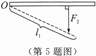5. 如图所示,一个可绕 $ O $ 点转动的杠杆处于静止状态,已知阻力 $ F_2 $ 的方向以及动力 $ F_1 $ 的力臂 $ l_1 $,请在图中补全阻力 $ F_2 $ 的力臂 $ l_2 $ 以及动力 $ F_1 $。