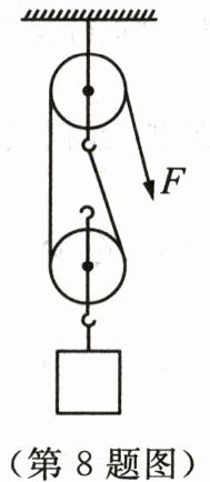 8. 用图示滑轮组提升 100 N 重物时,机械效率为 50%.用同一滑轮组提起 300 N 重物,重物以 2 m/s 速度匀速上升 5 s 时(不计绳重与摩擦),下列说法中错误的是(