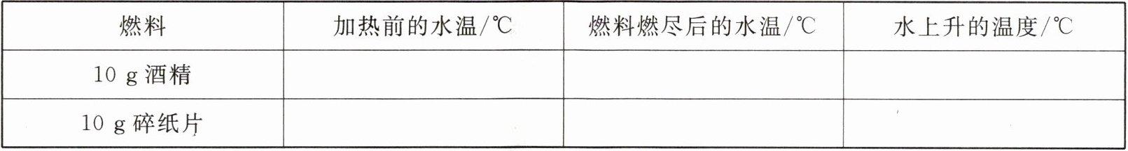 1. 合作探究:取等质量的酒精和碎纸片,加热等质量的水,将数据记录在下表中.