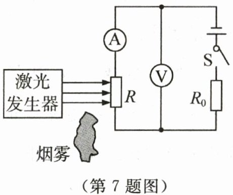 7. 小兰设计了一种烟雾报警装置,其简化电路如图所示,电源电压保持不变,$R_0$为定值电阻,R为光敏电阻,R的阻值随光照强度的减弱而增大,当电流表示数减小到某一值时,装置报警.开关S闭合后,当有烟雾遮挡射向R的激光时(