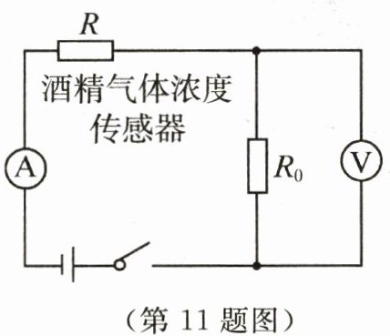 11. 如图所示是酒精气体浓度检测仪的简化电路图,图中$R_0$为定值电阻,R为酒精气体浓度传感器,R的电阻值随酒精气体浓度的增大而减小.如果驾驶员对着酒精气体传感器呼出的酒精气体浓度越大,那么(