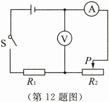 12. 如图所示的电路中,电源电压$U= 4.5\ V$且保持不变,电阻$R_1= 5\ \Omega$,滑动变阻器$R_2的最大阻值为20\ \Omega$,电流表量程为$0\sim 0.6\ A$,电压表量程为$0\sim 3\ V$.为保护电表,滑动变阻器接入电路的阻值范围是(