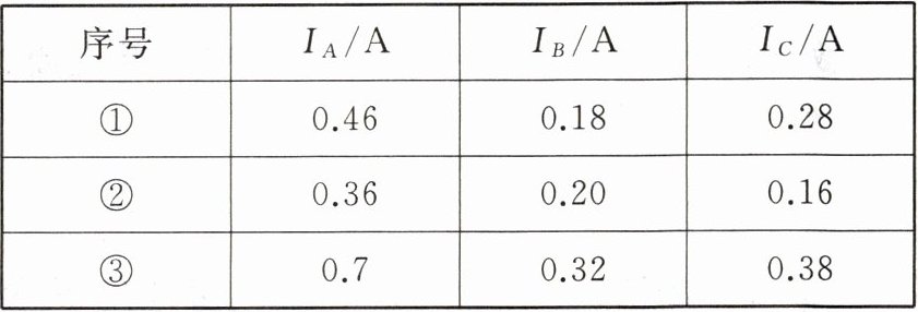 ;部分实验数据如表所示。|序号|$I_A/A$|$I_B/A$|$I_C/A$|