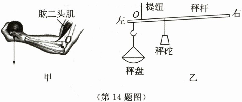 14. 人的前臂(图甲)可以看成是以肘关节为支点的杠杆,当手托物件匀速曲肘时,胳膊上的肱二头肌会对前臂施加一个动力,物件对前臂施加一个阻力,前臂这种结构的好处是