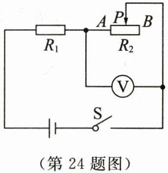 24. 如图所示,电源电压不变,闭合开关S,当滑片置于滑动变阻器的B端时,电压表的示数为$6 V,R_1$的功率为3.6 W;当滑片P置于滑动变阻器的中点时,电压表的示数变化了2 V.求: