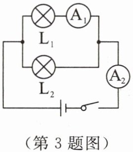 3. 如图所示,电源电压为$3\ V$,开关闭合后,电流表$A_{2}的示数为0.3\ A$,电流表$A_{1}的示数为0.2\ A$,灯泡$L_{1}$、$L_{2}$的连接方式是