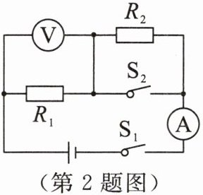 2. 在如图所示的电路中,电源电压保持不变,闭合开关$S_{1}$、$S_{2}$,电压表的示数为$3\ V$,电流表的示数为$0.3\ A$,断开$S_{2}$后,电压表的示数为$2\ V$,则下列判断正确的是(