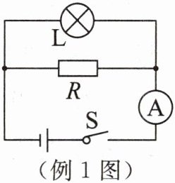 例1 如图所示,小灯泡$L$上标有“$12\ V\ 0.3\ A$”字样,$R = 20\ \Omega$,闭合开关$S$,小灯泡正常发光,则电流表的示数是多少?