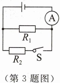 3. 在如图所示的电路中,开关$S$从断开到闭合,电流表$A前后两次示数之比为2:5$;若将电阻$R_{1}$、$R_{2}$串联在电路中,则它们两端的电压之比为(