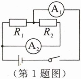 1. 在如图所示的电路中,闭合开关,电流表$A_{1}与电流表A_{2}的读数之比是5:2$,则两个电阻$R_{1}与R_{2}$之比是(