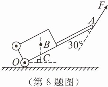 8. 如图所示为一拉杆旅行箱的示意图,将其视为杠杆,$ O $为支点,$ B $为重心,$ BC $为竖直方向,$ A $为拉杆的端点.已知箱重为$ 250 \, N $,$ OA 为 120 \, cm $,$ OC 为 24 \, cm $.