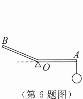 6. 如图所示,$ AOB $为一杠杆,$ O $为支点,杠杆自重不计,$ AO = OB $.在杠杆右端$ A 处用细绳悬挂重为 G $的物体,当$ AO $段处于水平位置时,为保持杠杆平衡,需在$ B 端施加最小的力为 F_{1} $;当$ OB $段在水平位置时保持杠杆平衡,这时在$ B 端施加最小的力为 F_{2} $,则