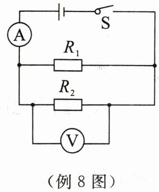 例 8 在如图所示的电路中,开关 $ S $ 闭合后两表正常工作,若一段时间后 $ R_{2} $ 断路,则电流表的示数将